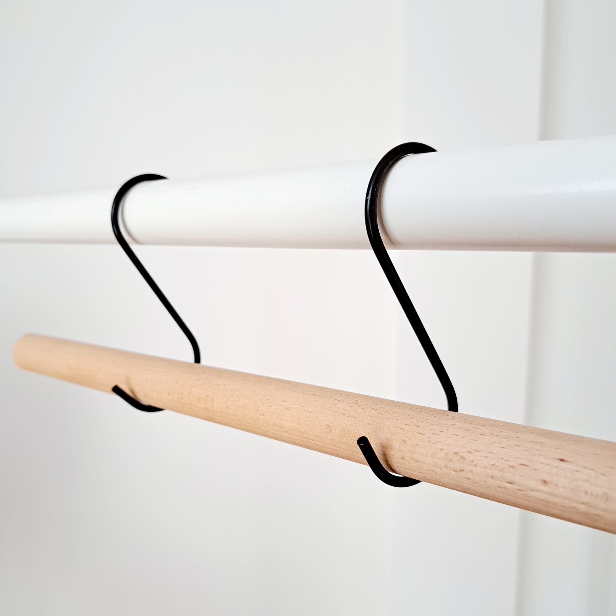 Metalowe haki do zawieszenia drążka.